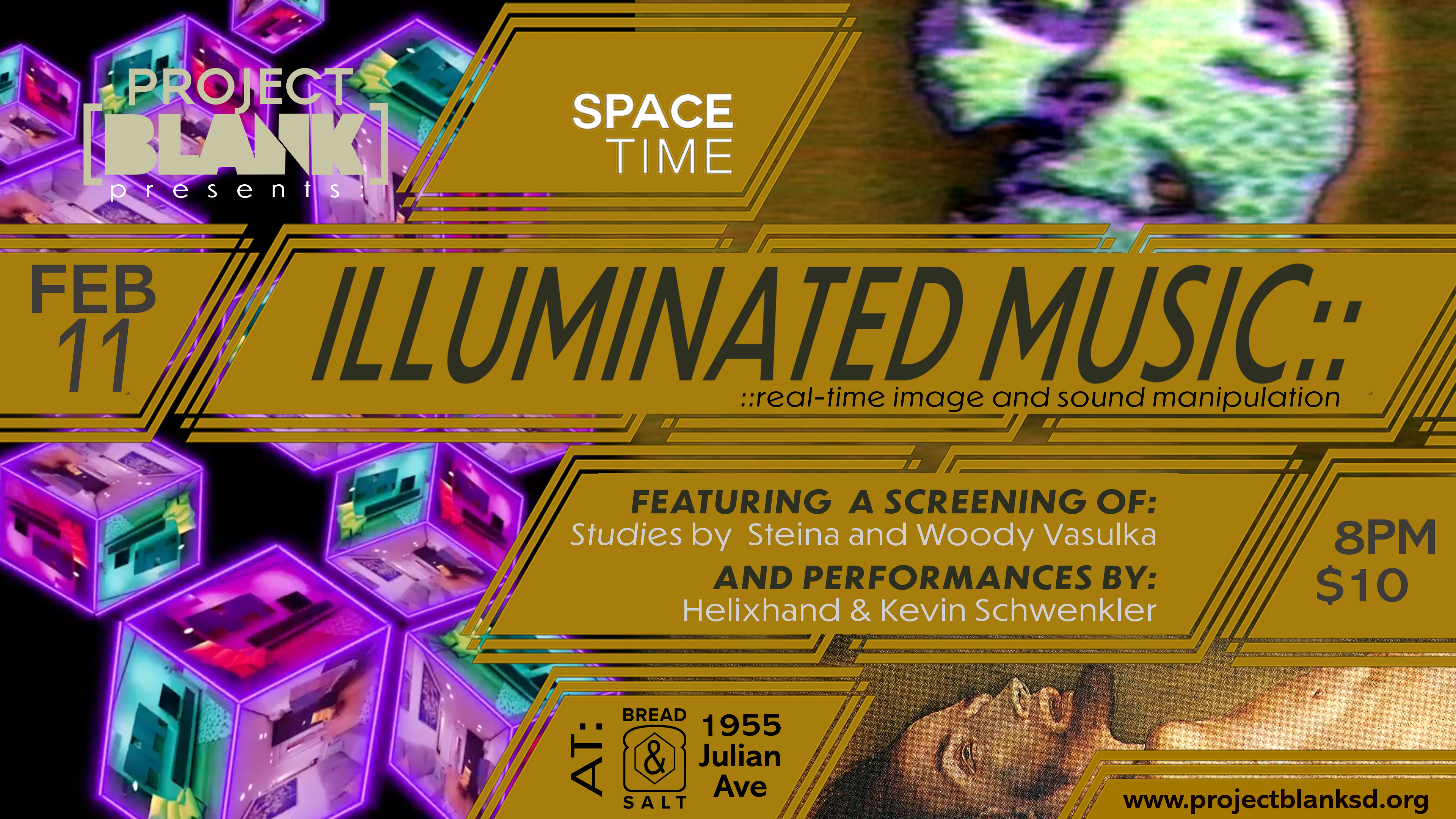 SPACE TIME is pleased to present a program of “illuminated music,*” featuring various methods of real-time image and sound manipulation. The program will begin with a screening of Studies by video art pioneers Steina and Woody Vasulka. “The Vasulkas' investigations into analog and digital processes and their development of electronic imaging tools, which began in the early 1970s, place them among the primary architects of an expressive electronic vocabulary of image-making.” In 1971, The Vasulkas founded The Kitchen in NYC, which has served as a model for multidisciplinary arts organizations, including Space Time and Project [BLANK].